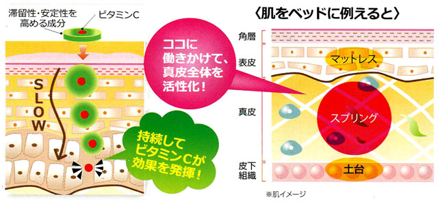 『薬用リンクルホワイトクリーム』の有効成分は、「L-アスコルビン酸2-グルコシド」という美白効果の高いビタミンC誘導体です。熱・光・水・空気に強く、肌内部に長時間留まって、メラニンを黒くする酵素にじっくりと働きかけ、シミを作らせません。